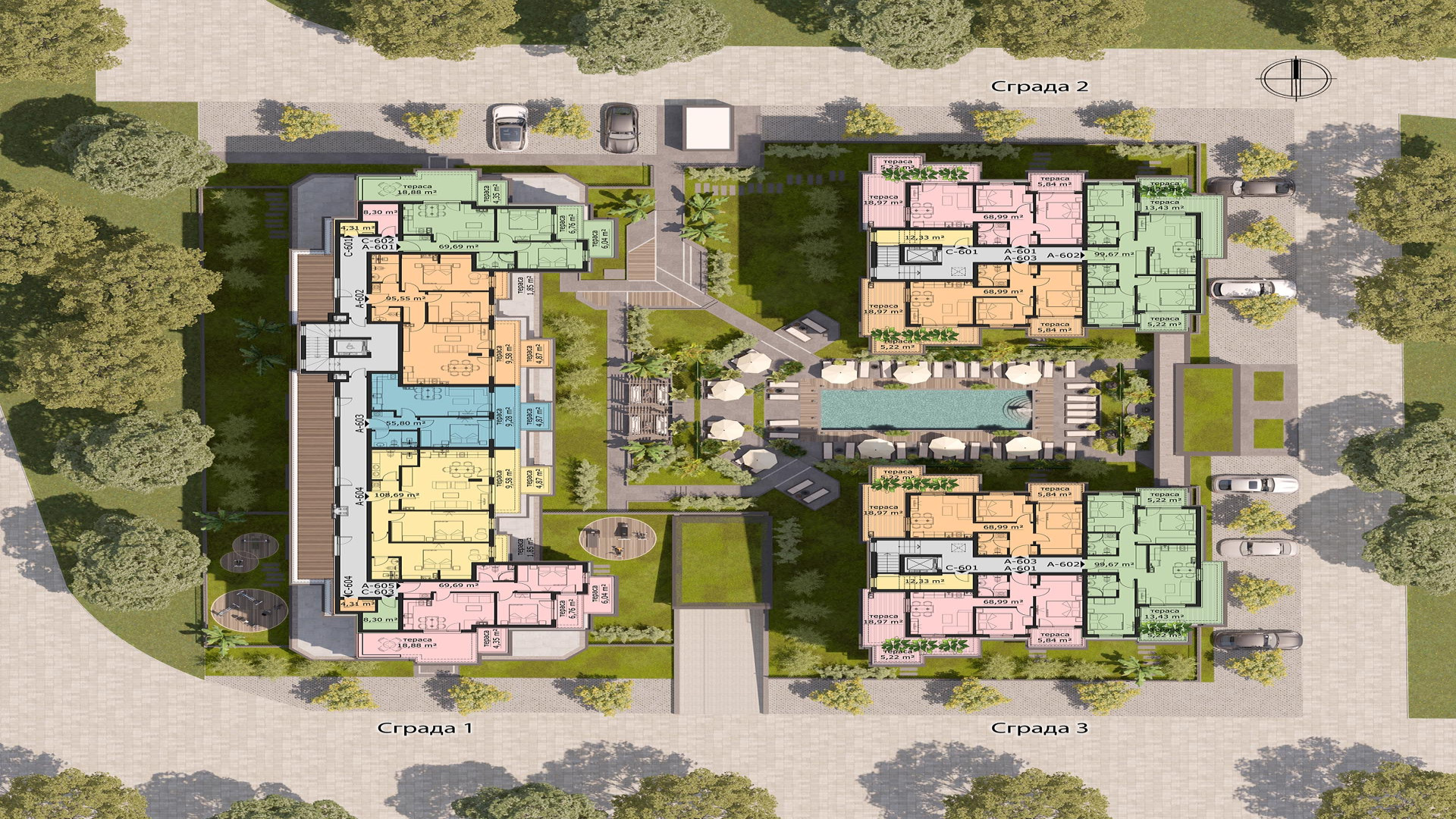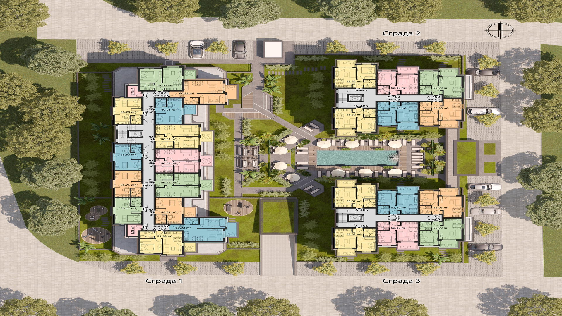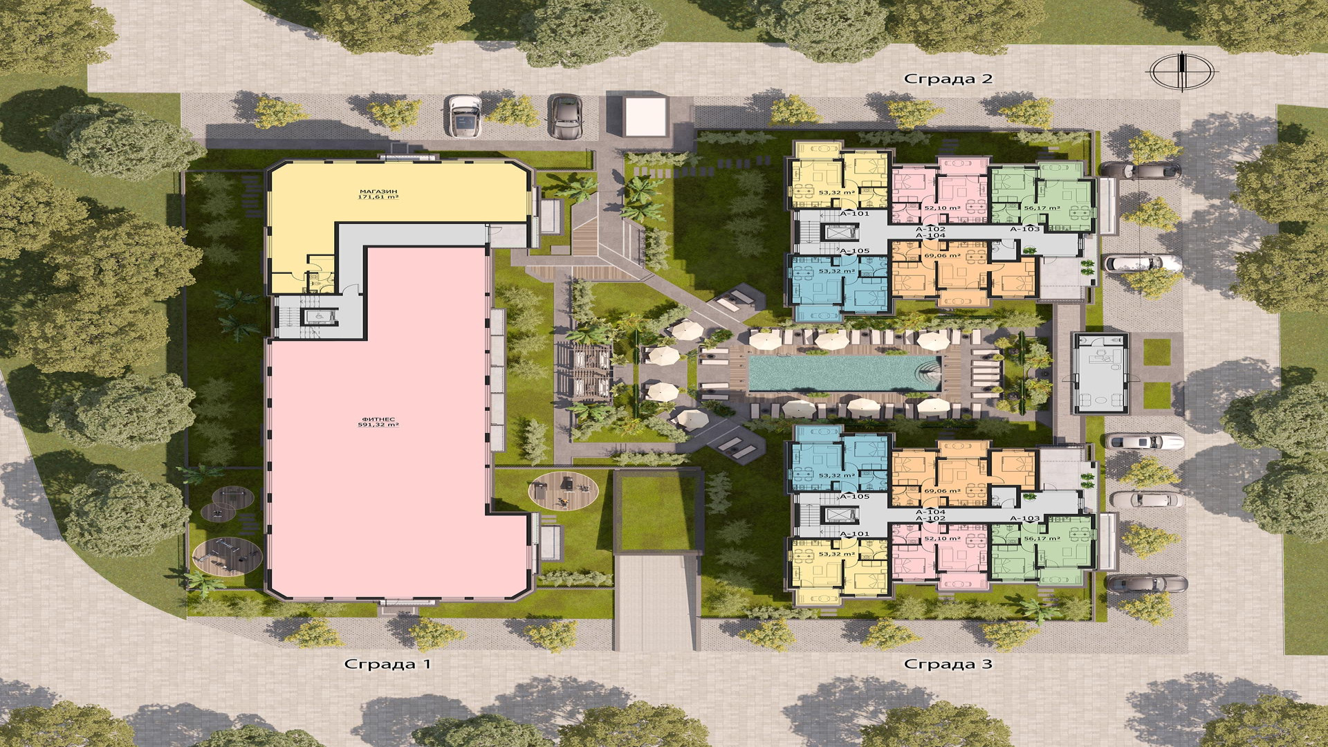 Ein gemeinsamer Empfangsbereich wird die Gebäude 2 und 3 miteinander verbinden und die Verwaltung des Komplexes sowie die Vermietung von Wohnungen für Kunden, die sich für den Kauf der Immobilie zu Investitionszwecken entschieden haben, ermöglichen. Jedes der beiden Gebäude wird aus 31 Wohnungen bestehen, die sich auf sechs Etagen verteilen. Im Zentrum des Projekts wird ein Swimmingpool für Erwachsene im asiatischen Stil stehen, der von einer exotischen Vegetation umgeben ist, die Sie in eine paradiesische Ecke versetzt!