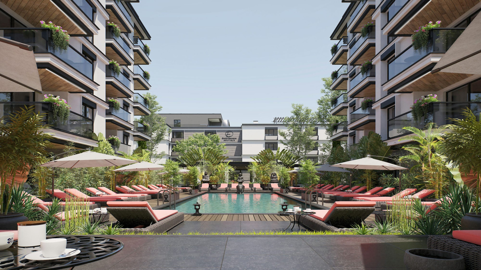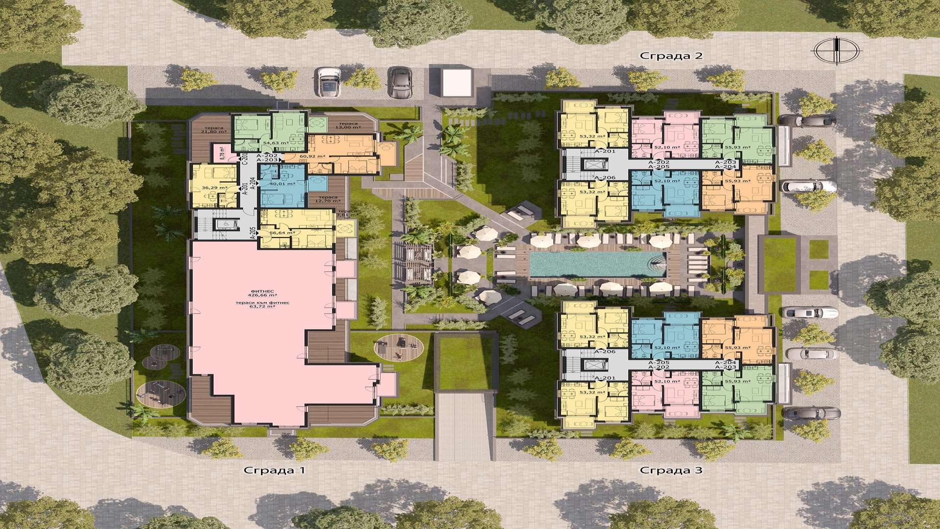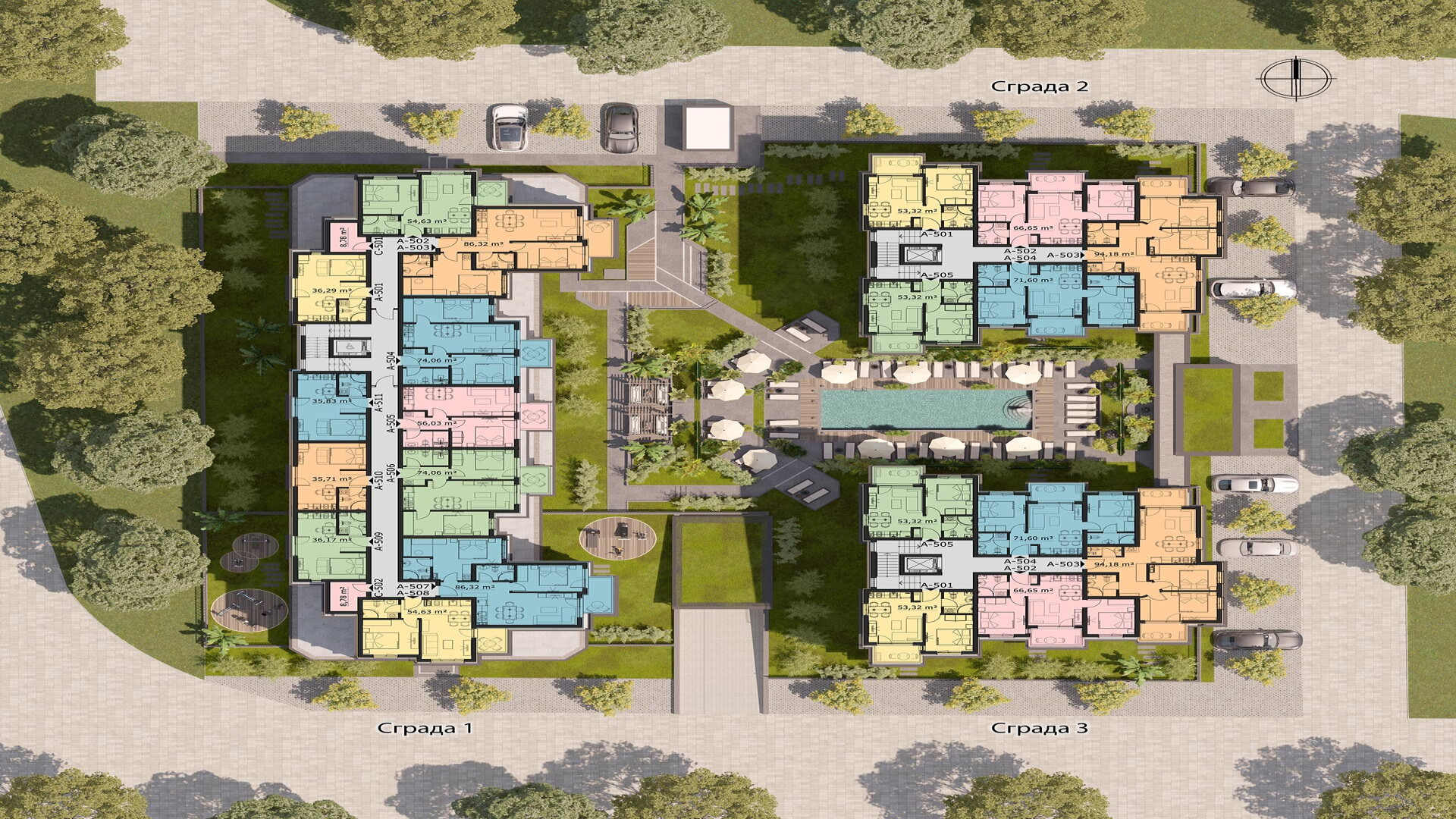 Ein gemeinsamer Empfangsbereich wird die Gebäude 2 und 3 miteinander verbinden und die Verwaltung des Komplexes sowie die Vermietung von Wohnungen für Kunden, die sich für den Kauf der Immobilie zu Investitionszwecken entschieden haben, ermöglichen. Jedes der beiden Gebäude wird aus 31 Wohnungen bestehen, die sich auf sechs Etagen verteilen. Im Zentrum des Projekts wird ein Swimmingpool für Erwachsene im asiatischen Stil stehen, der von einer exotischen Vegetation umgeben ist, die Sie in eine paradiesische Ecke versetzt!