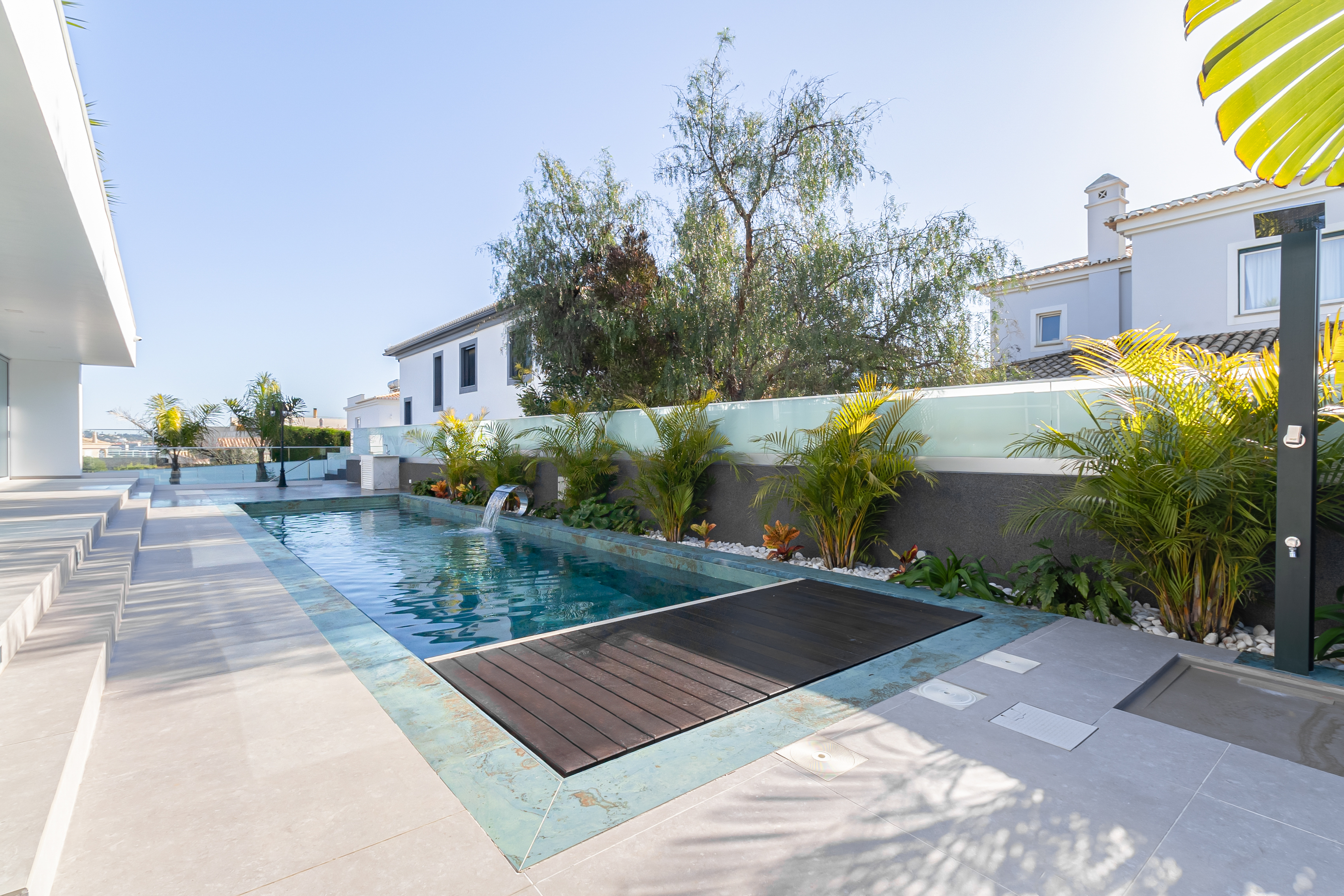 LUXUS-VILLA MIT 4 SCHLAFZIMMERN IN CERRO DAS MÓS, LAGOS, PORTUGAL Entdecken Sie diese exquisite Luxusvilla mit Salzwasserpool mit Wasserfall, Beleuchtung und transparentem Dach mit Beleuchtungssystem, umgeben von einem üppigen Garten und mit hervorragender Sonneneinstrahlung. Diese anspruchsvolle Immobilie verfügt über ein zeitgenössisches Design, hochwertige Oberflächen und Premium-Geräte. Es befindet sich in einer der ruhigsten und begehrtesten Gegenden von Lagos. Nur wenige Minuten vom Zentrum, den Stränden, dem berühmten Leuchtturm Ponta da Piedade und der Altstadt von Lagos entfernt, bietet es auf seinen zwei Etagen und der Terrasse eine perfekte Mischung aus Luxus und Zweckmäßigkeit: Erdgeschoss: – Geräumige Garage für zwei Autos, großer Abstellraum, großzügige Waschküche mit Waschmaschine und Trockner, kleiner Tank, Bügelbrett, Service-Badezimmer, ausgestatteter Fitnessraum, privater Kinoraum mit modernstem Oled-TV, Soundsystem, Lautsprechern und Stühlen – Schlafzimmer mit Einbauschrank, voll ausgestattete offene Küche und Wohnzimmer. In der Praxis wird daraus ein unabhängiges Ein-Zimmer-Appartement, das z. B. als Dienstmädchen-Appartement oder als “Gästehaus” für Ihre Besucher genutzt werden kann. – Erster Stock: Offene Küche, komplett ausgestattet mit Kühl-/Gefrierkombination, zweitem Gefrierschrank, Bosch-Backofen und Mikrowelle, Küchenmaschine, Kaffeemaschine und Kühlschrank für Weinflaschen, Wohnzimmer mit Zugang zur Poolterrasse – Der beheizte Salzwasserpool (einer der Höhepunkte dieser herrlichen Villa) verfügt über eine komplett ausgestattete Außenküche mit Grill, transparenter Abdeckung und Beleuchtung, die Ihre Abende unvergesslich macht. Hauptschlafzimmer mit direktem Zugang zum Pool, begehbarem Kleiderschrank und eigenem Bad mit Haartrockner und Bodenwaage – Schlafzimmer (Nr. 2) mit Einbauschrank und eigenem Bad mit Bodenwaage und Haartrockner.