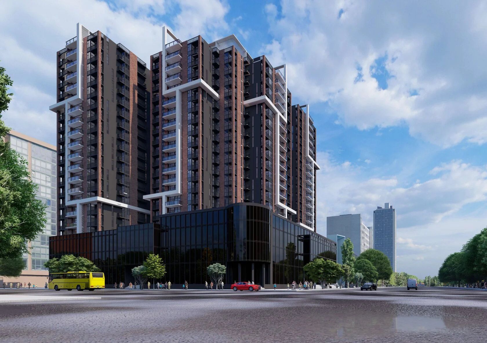 Die Investition besteht aus drei 20-stöckigen Gebäuden, in denen verschiedene Wohnungen verfügbar sind – von kompakten und funktionalen Studios über geräumige Ein- oder Zweizimmerwohnungen bis hin zu größeren Familienwohnungen. Einer der Vorteile des Projekts ist seine Lage im Stadtzentrum, wodurch die Bewohner direkten Zugang zu Geschäften, Restaurants, Cafés und Dienstleistungen haben, und der im Erdgeschoss des Gebäudes befindliche Handels- und Dienstleistungsbereich erhöht den Komfort und die Lebensqualität im Alltag.