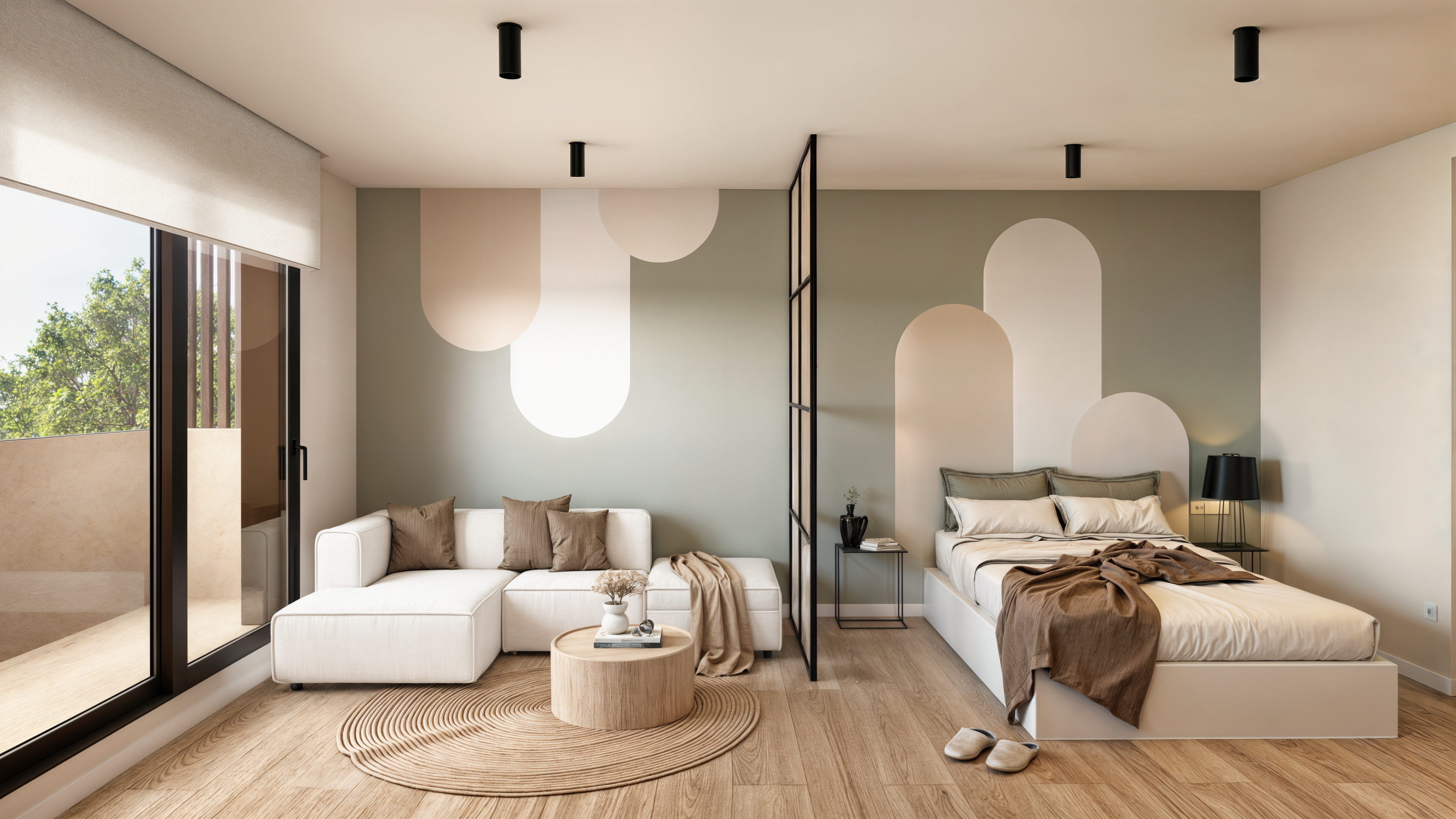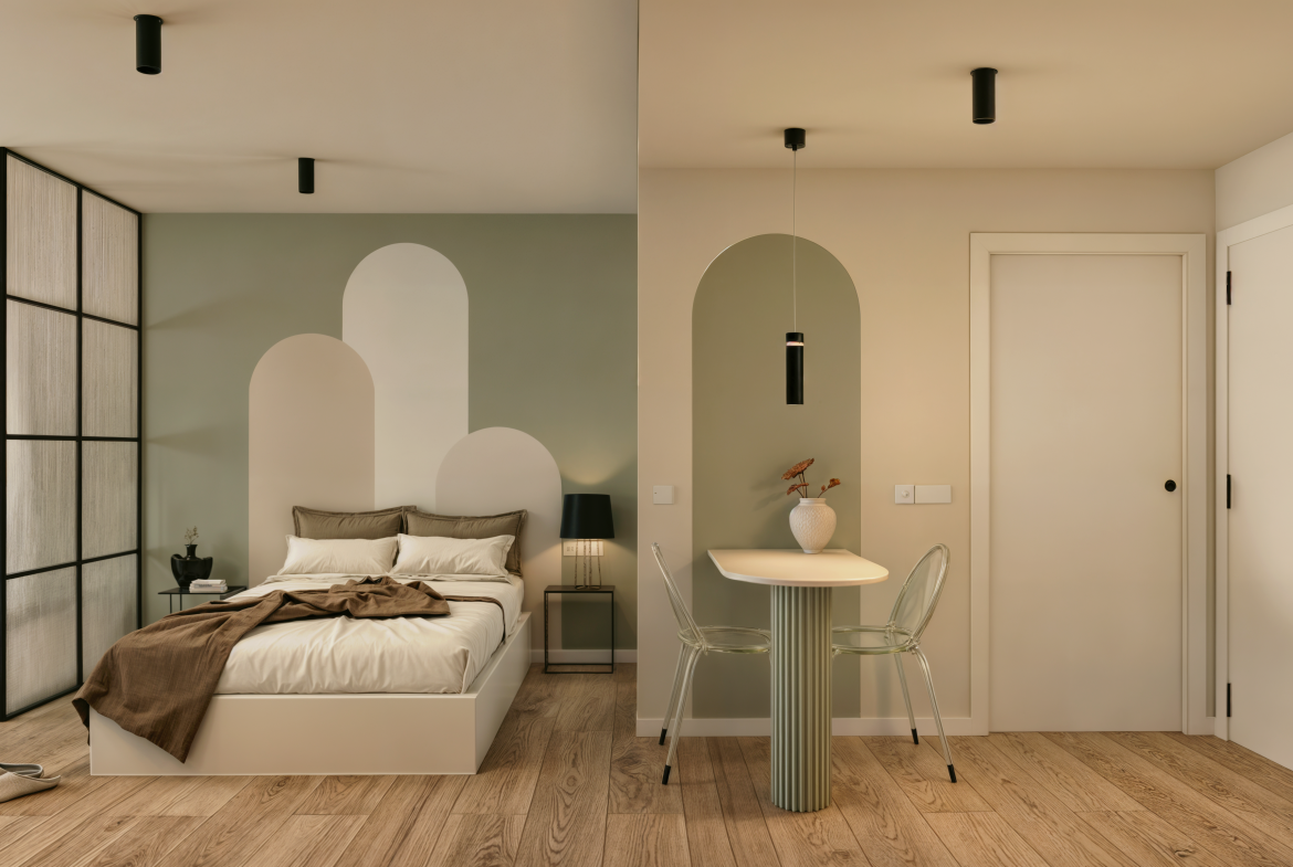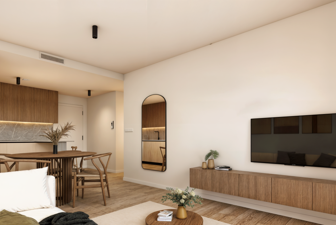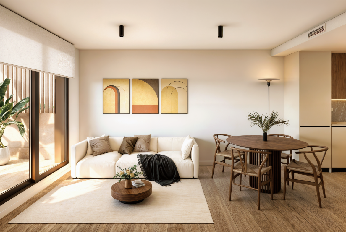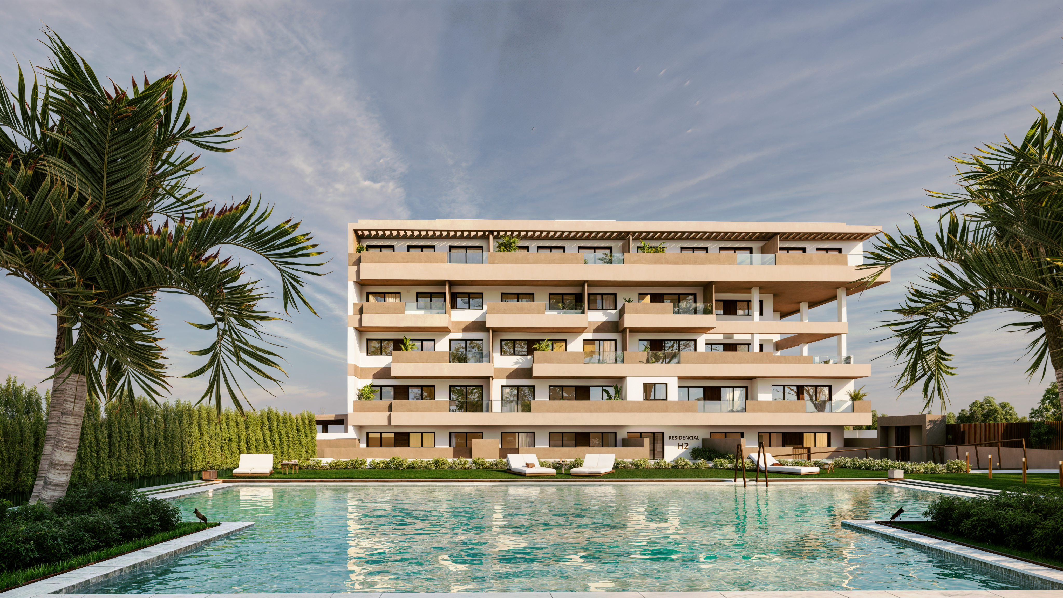 ✨ Highlights der Wohnanlage – Studios sowie Wohnungen mit 2 und 3 Schlafzimmern – Jede Wohnung verfügt über eine große Terrasse – Im Preis inbegriffen: Garage + Abstellraum – Riesiger Swimmingpool im Resort-Stil – Große Glasflächen, die Wohnzimmer und Terrasse miteinander verbinden – Hoher Ausbaustandard, armarios empotrados, gres/tarama – Hauptschlafzimmer mit Bad en suite 🏡 Wohnbereich – ein Raum, der lebt In Residencial H2 bilden Wohnzimmer, Küche und Terrasse einen dynamischen Raum.