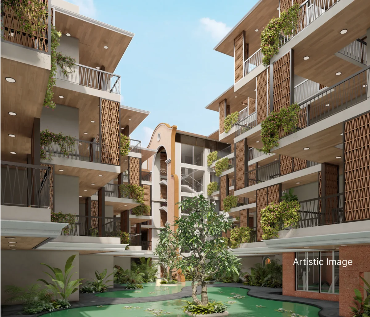 Ein gemütlicher Komplex mit 80 Apartments, entworfen vom renommierten Bauträger Sea Breeze Villas – in der ruhigen, exklusiven Gegend von Siolim im Norden von Goa. Jede Wohnung (außer den Studios) verfügt über einen eigenen Pool, und die Anlage bietet zahlreiche Annehmlichkeiten wie einen Fitnessclub, Entspannungsbereiche, Grünflächen und eine 24/7-Überwachung.