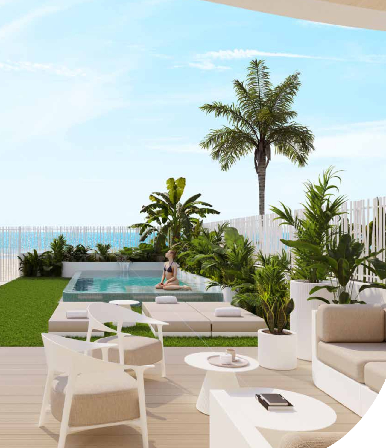 Przestronne wspólne strefy, wyposażone w leżaki i tropikalną roślinność