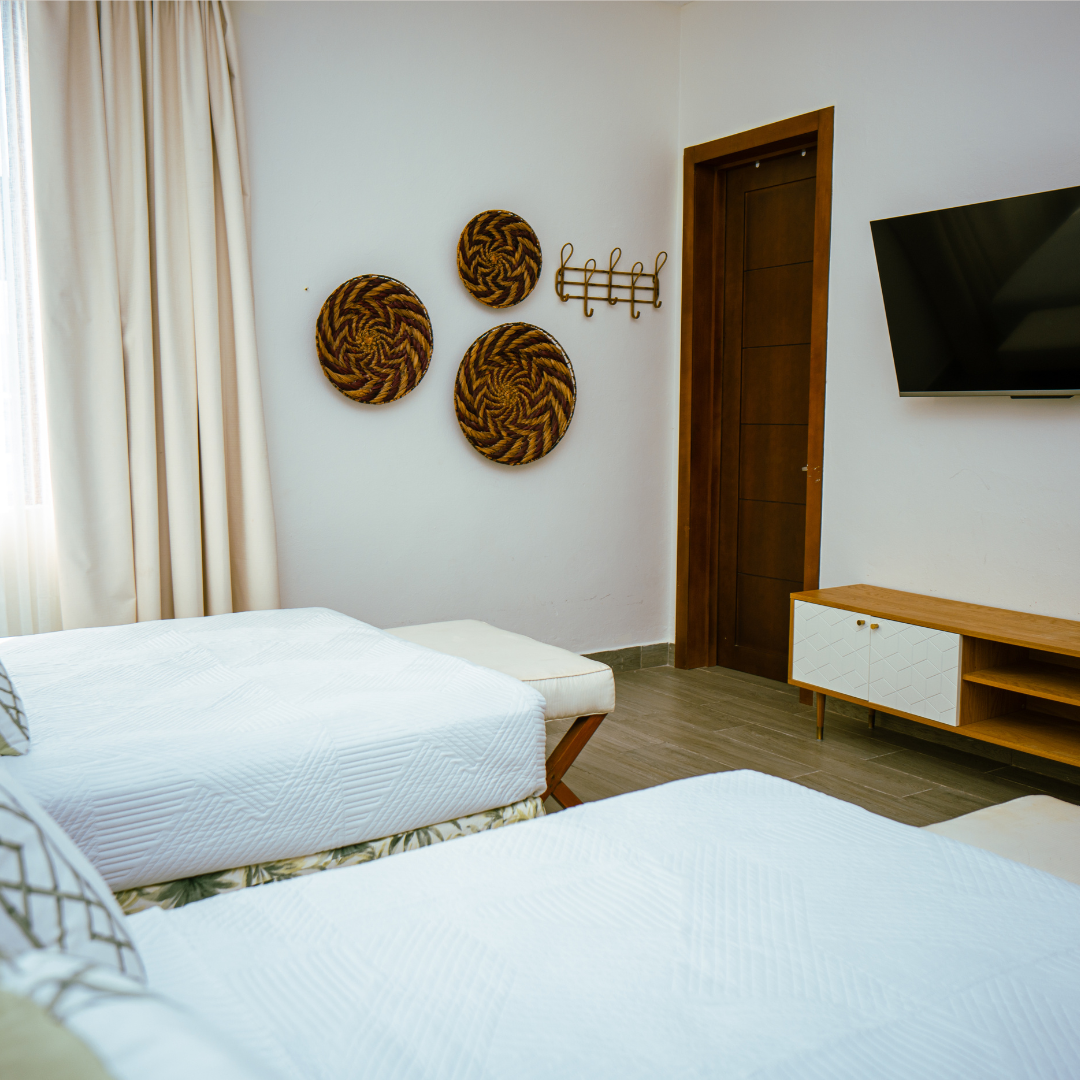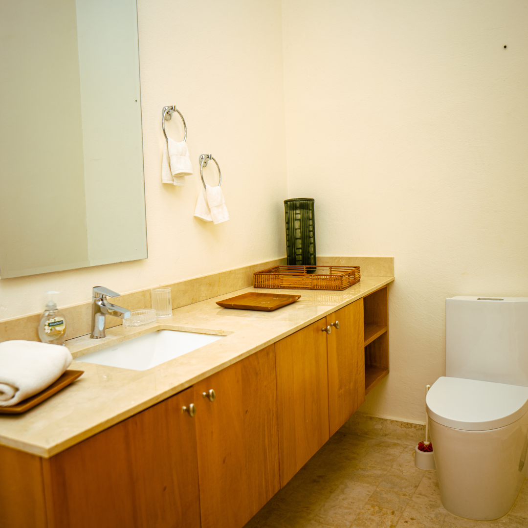 Jedes Schlafzimmer, einschließlich eines Serviceraums, verfügt über ein eigenes Badezimmer und bietet Ihnen und Ihren Gästen maximalen Komfort. Die Ausrichtung der Villa zum Meer sorgt für eine erfrischende tropische Brise und unterstreicht die ruhige und luxuriöse Atmosphäre.