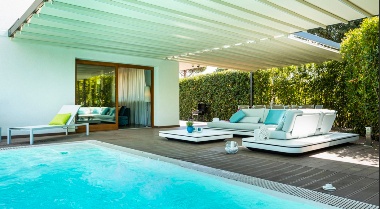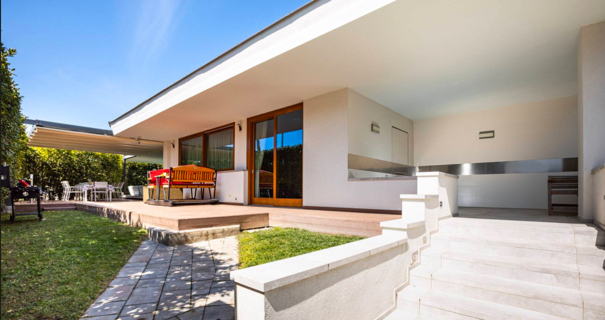 Na zewnątrz willi znajduje się prywatny basen otoczony tarasem z miejscami do wypoczynku, a także zadbany ogród zapewniający prywatność. Nieruchomość wyposażona jest w systemy bezpieczeństwa, klimatyzację oraz autonomiczne ogrzewanie.
