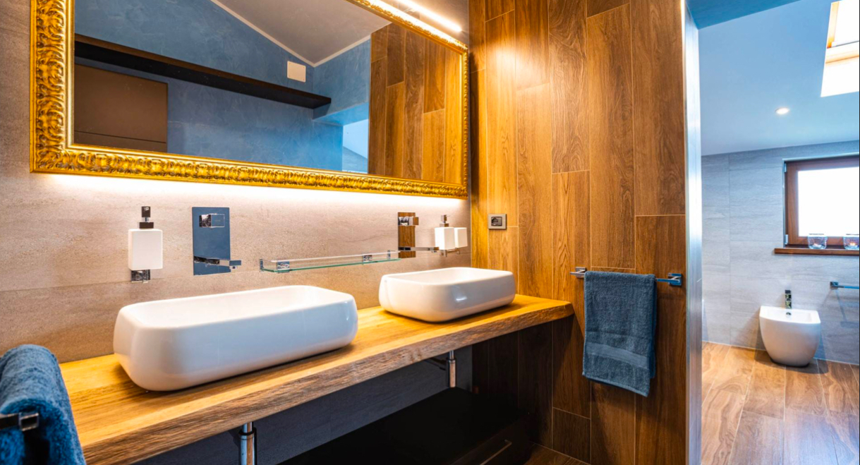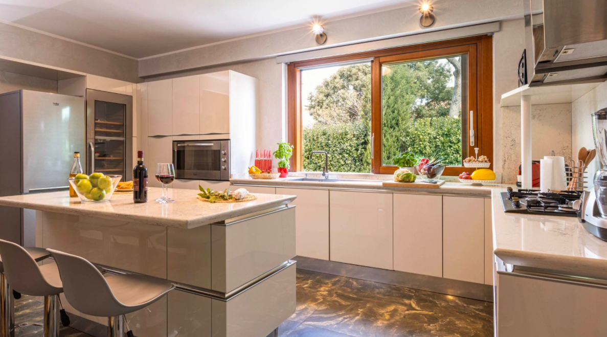 – Na parterze znajduje się przestronny salon z dużymi przesuwanymi oknami, które otwierają się na piękny taras z widokiem na basen. Wysokie sufity, kominek oraz otwarta kuchnia z wyspą centralną wyposażoną w najwyższej jakości sprzęt tworzą niezwykłą atmosferę. Dodatkowo na tym poziomie znajdują się jadalnia, łazienka z prysznicem i hydromasażem oraz pralnia.