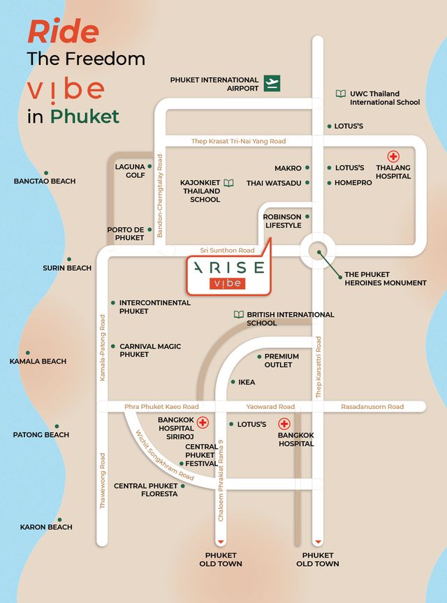 Arise Vibe is located in Si Sunthon, Thalang, one of the most promising areas of Phuket. Bang Tao Beach is 8 km away, Robinson Lifestyle Thalang, international schools, and medical centers are nearby. Convenient access to major roads provides quick travel to Phuket Airport, tourist areas and business centers. The calm atmosphere of the area makes it an attractive place to live and invest.