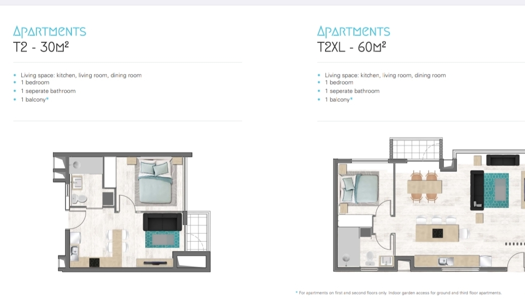 🏡 Apartment types: ✨ T2 – 1 bedroom | 30 m² Cozy apartments with living room, bedroom, bathroom and balcony or private garden.