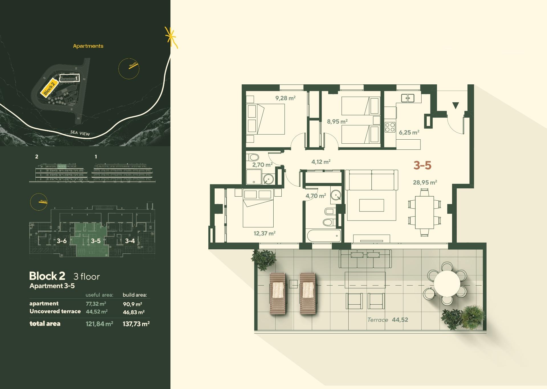 All apartments have a wonderful view of the sea. Complex infrastructure includes everything you need for a comfortable life: a safe area, natural and designer landscaping, adult and children’s pools, a gym, a golf course, pétanque.