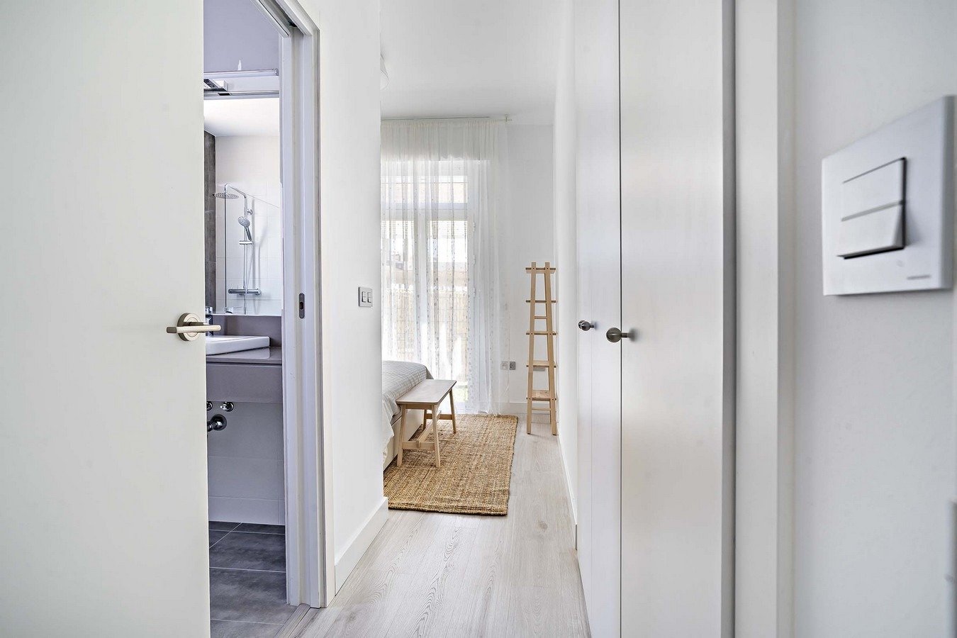 The doors and fitted wardrobes are lacquered in white and the floor is made of laminated wood.