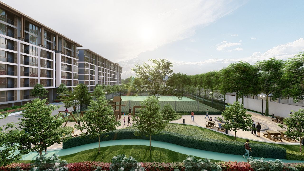 The 81 sqm two-bedroom apartment features a spacious living area, two separate bedrooms and balconies with picturesque views of the golf courses and surrounding area. The interiors are minimalist, with a functional kitchen, two bathrooms and thoughtful storage systems, ideal for family living.