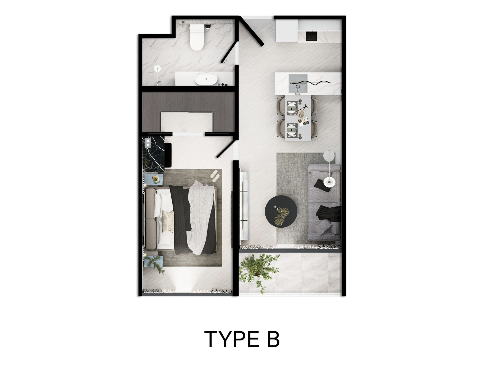 One-bedroom apartment 42.5 m² – ideal for a couple or renters who value comfort. A spacious kitchen-living room, a separate bedroom, a full bathroom, and thoughtful storage spaces make living convenient for both short and long trips.