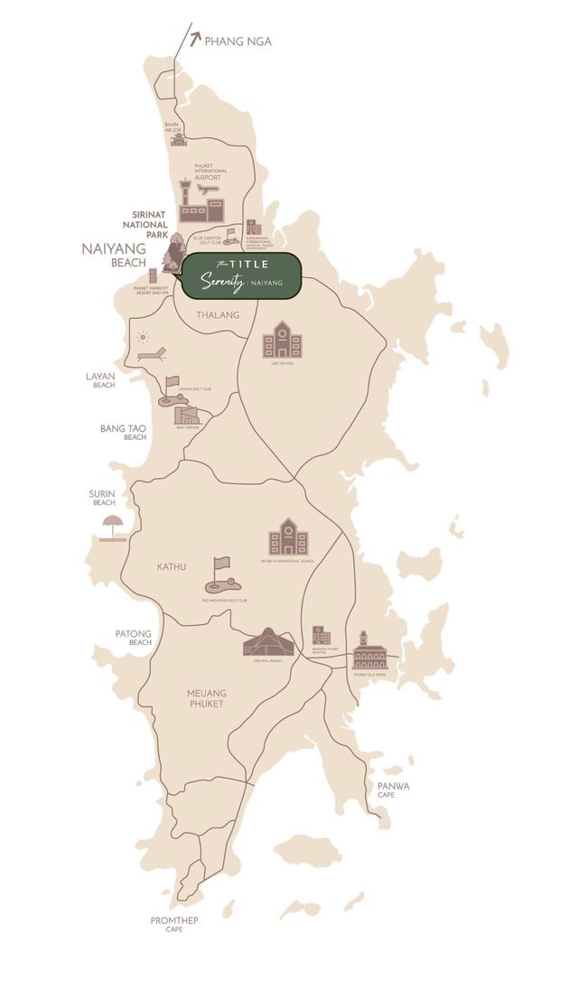 The Title Serenity Naiyang is located in the northwest part of Phuket, next to Naiyang Beach and Sirinat National Park. This is one of the most peaceful and green areas of the island with developed infrastructure. The international airport is only 10 minutes away. Convenient transport accessibility is combined with a secluded atmosphere. Cafes, shops, medical institutions and educational centers are located nearby, which makes the location attractive for living and investment.