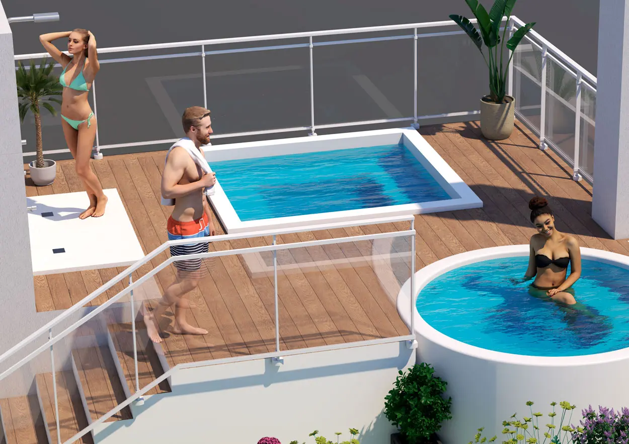 - Spa & Solarium area – 2 Jacuzzis, showers, sun loungers and a rooftop pergola overlooking the city