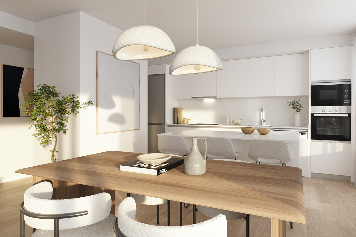 The apartments offer large windows that connect the interior with the terrace and let in plenty of natural light. The open-space kitchen is equipped with quartz conglomerate countertops, appliances from renowned brands, and stylish kitchen furniture.