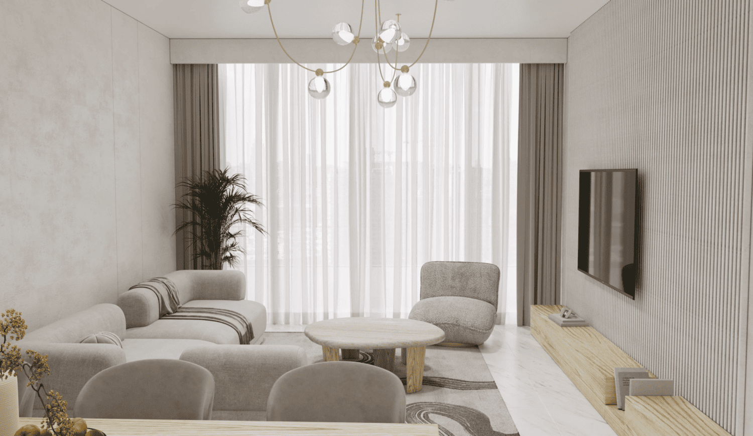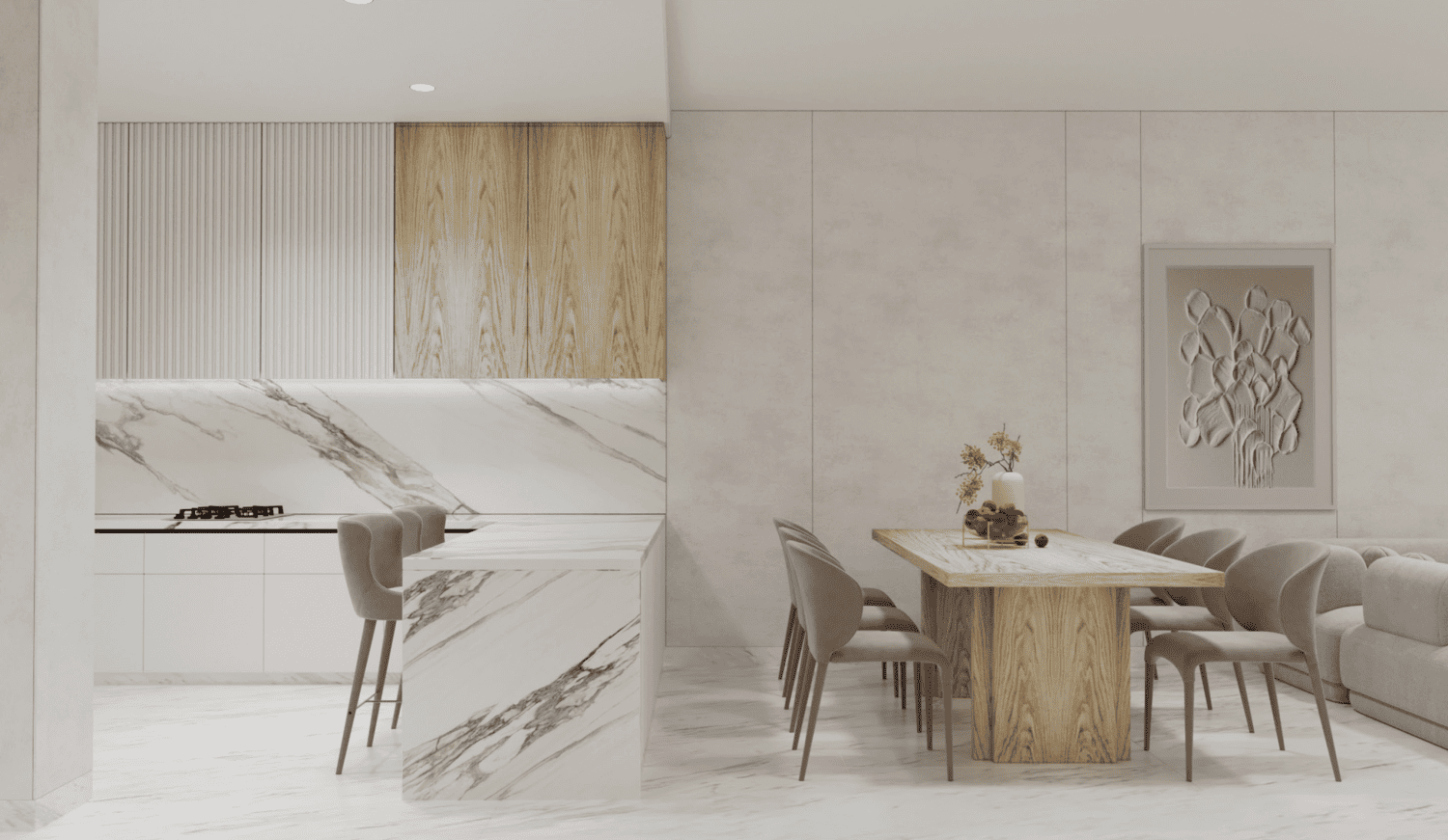 Panoramiczne okna od podłogi do sufitu otwierają widok na spokojne wody zatoki, wprowadzając do wnętrza mnóstwo naturalnego światła. Starannie zaplanowany układ zapewnia płynność przestrzeni między salonem, kuchnią i częścią wypoczynkową.