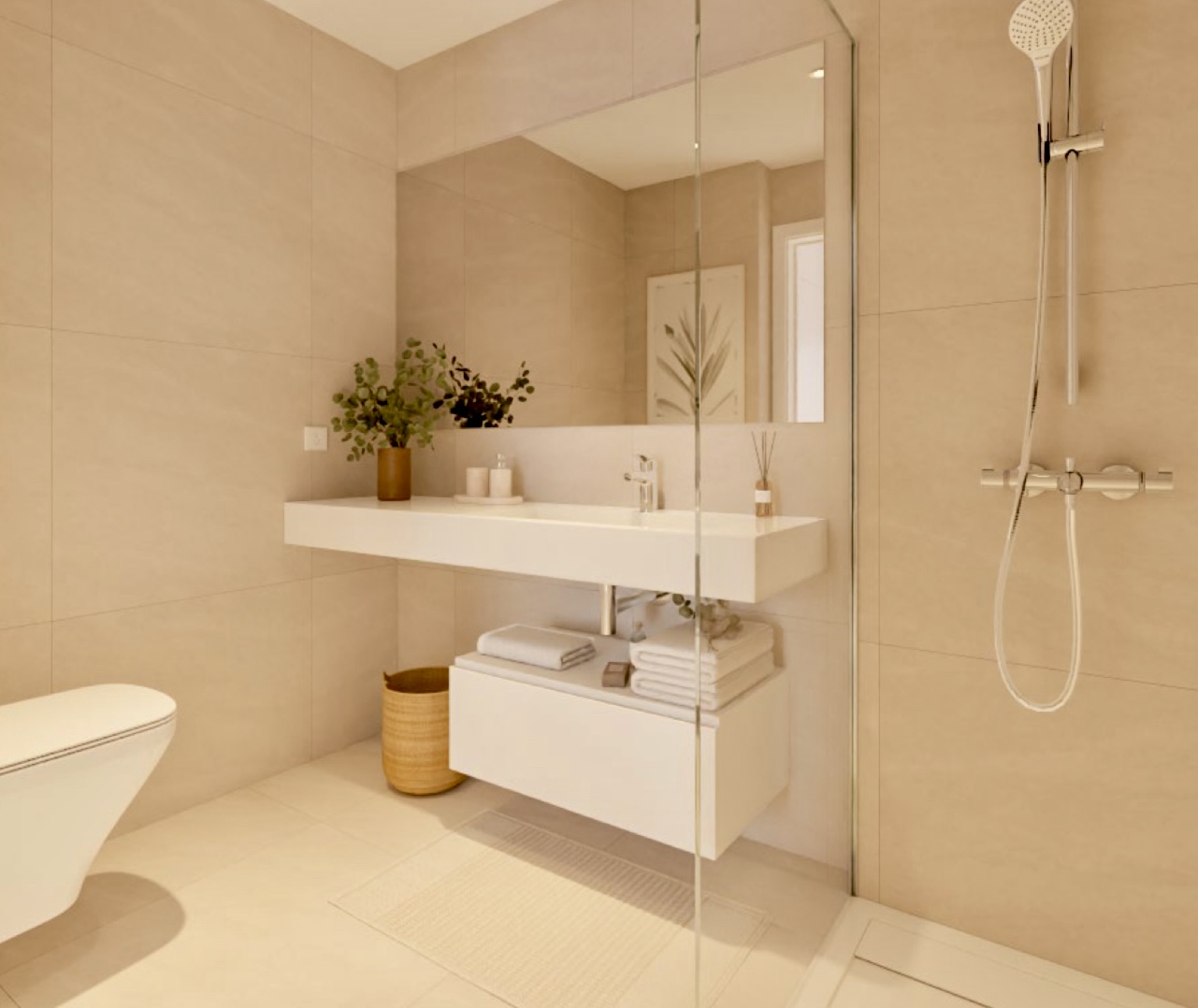 – Раковина со смесителем и системой разделения отходов. – Ванные комнаты отделаны керамогранитом, прочным и элегантным. – Душ с поддоном, термостатическим смесителем и стеклянным экраном. – Подвесные потолки и экологичные краски для стен.