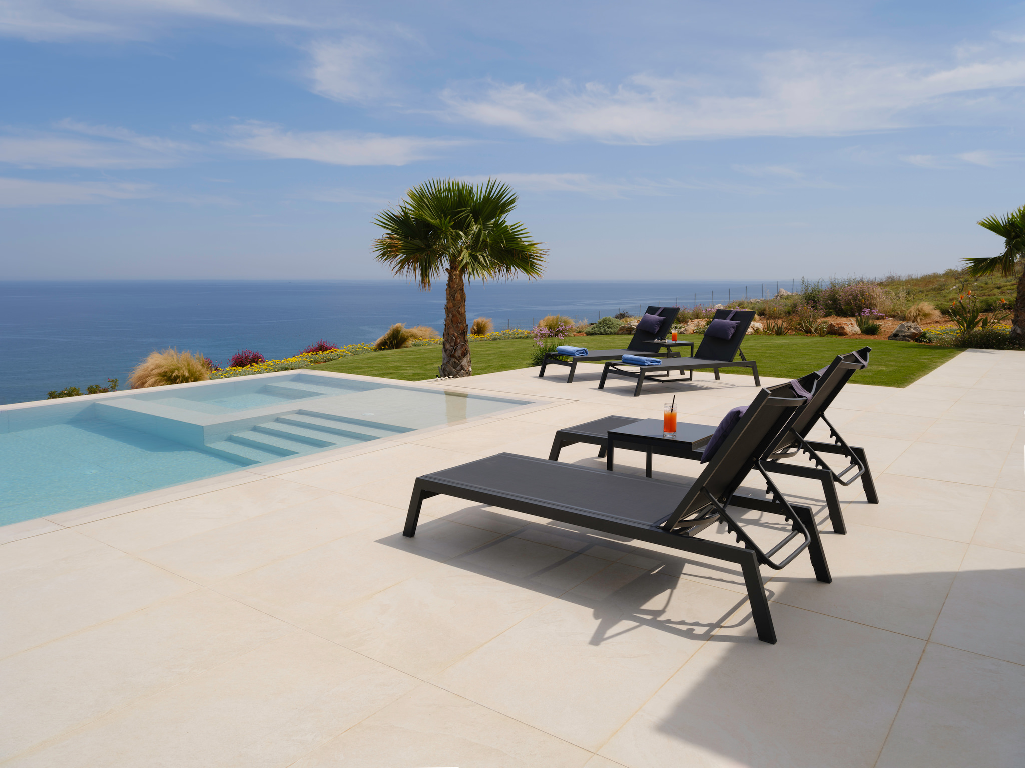 На участке площадью 4 462,76 м² создается резиденция с 4 спальнями, в которой практически исчезает граница между внутренним и внешним пространством. Жилая и внешняя зоны (террасы, беседки, бассейн с мокрым бортиком) расположены на одном уровне, открывая захватывающие виды на море – без каких-либо препятствий. Ночные зоны распределены на двух уровнях, с четким приоритетом на приватность и автономию для владельцев дома.