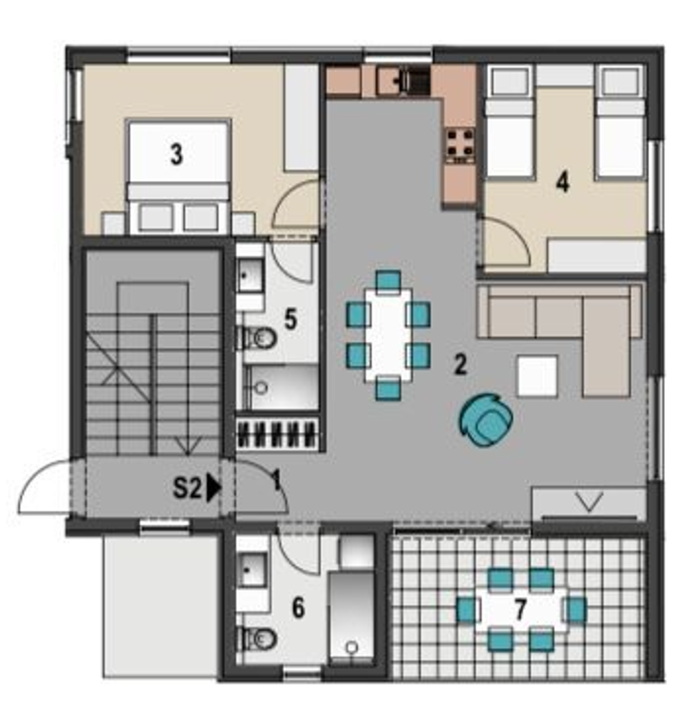 – прихожая + лестница – 10,90 м2 – общая ванная комната – 4,40 м2 – спальня с детскими кроватями – 10,20 м2 – спальня с двуспальной кроватью и выходом на собственный балкон – 10,60 м2 + балкон 8,80 м2 – спальня с двуспальной кроватью и собственной ванной комнатой – 12,70 м2 + ванная комната 4,30 м2 S4 – РАЗВИТИЕ: 2-й этаж: