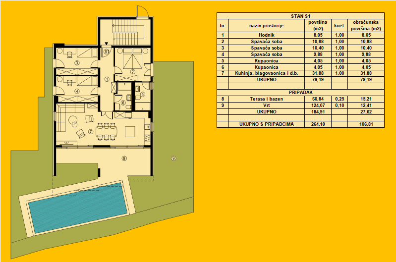 Продается последняя квартира в новом комплексе. Это комплекс из 3 зданий, расположенных рядом друг с другом. Эта квартира находится в середине здания на первом этаже. Квартира имеет частный бассейн и сад, а также парковочное место. Квартира состоит из большой спальни с собственной ванной комнатой и двух небольших спален, гостиной с кухней и столовой и дополнительной ванной комнаты. Из гостиной площадью более 30 м2 есть выход на просторную террасу и к бассейну и саду. Сама терраса и бассейн занимают 60 м2, а вся открытая площадка – 185 м2, что вместе с квартирой дает 264 м2! Здания расположены в тихой части города, вдали от туристического трафика, но имеют прекрасный панорамный вид на море и зелень.