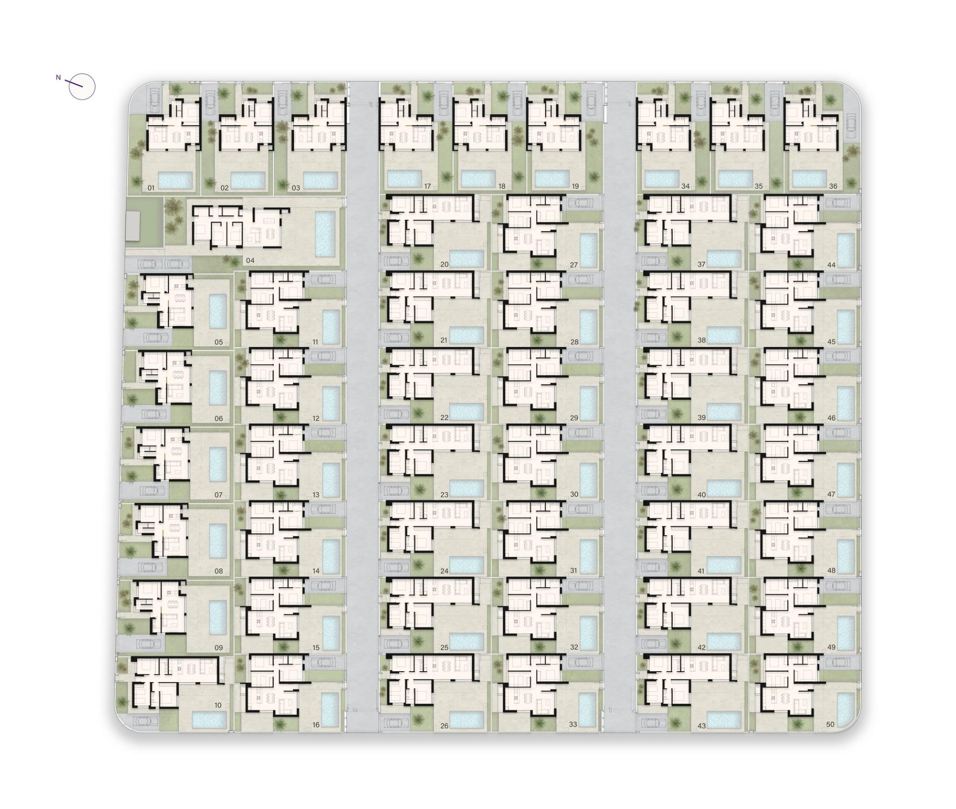 Виллы: Независимые объекты недвижимости с тремя спальнями и 2/3 ванными комнатами, доступные в одно- или двухэтажном варианте. Каждая вилла включает в себя частный бассейн, солярий и парковочное место на территории участка. Также доступны дополнительные подвальные помещения.